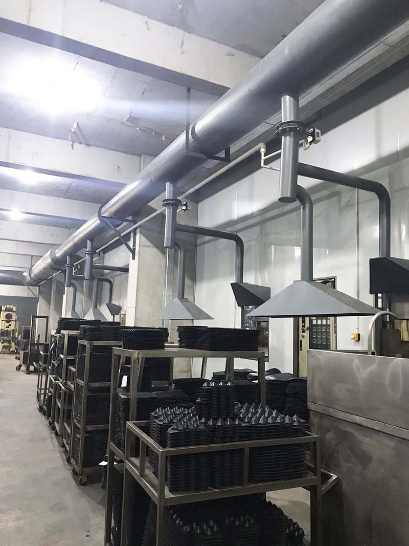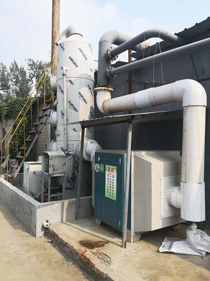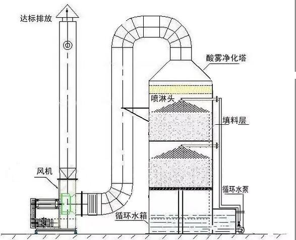 工作原理:廢氣凈化噴淋塔主要的運作方式是廢氣由風管引入凈化塔,經過填料層,廢氣與氫氧化鈉吸收液進行氣液兩相充分接觸吸收中和反應,廢氣經過凈化后,再經除霧板脫水除霧后由風機排入大氣。吸收液在塔底經水泵增壓后在塔頂噴淋而下,然后回流至塔底循環使用。凈化后的廢氣達到地方排放標準的排放要求,低于國家排放標準。